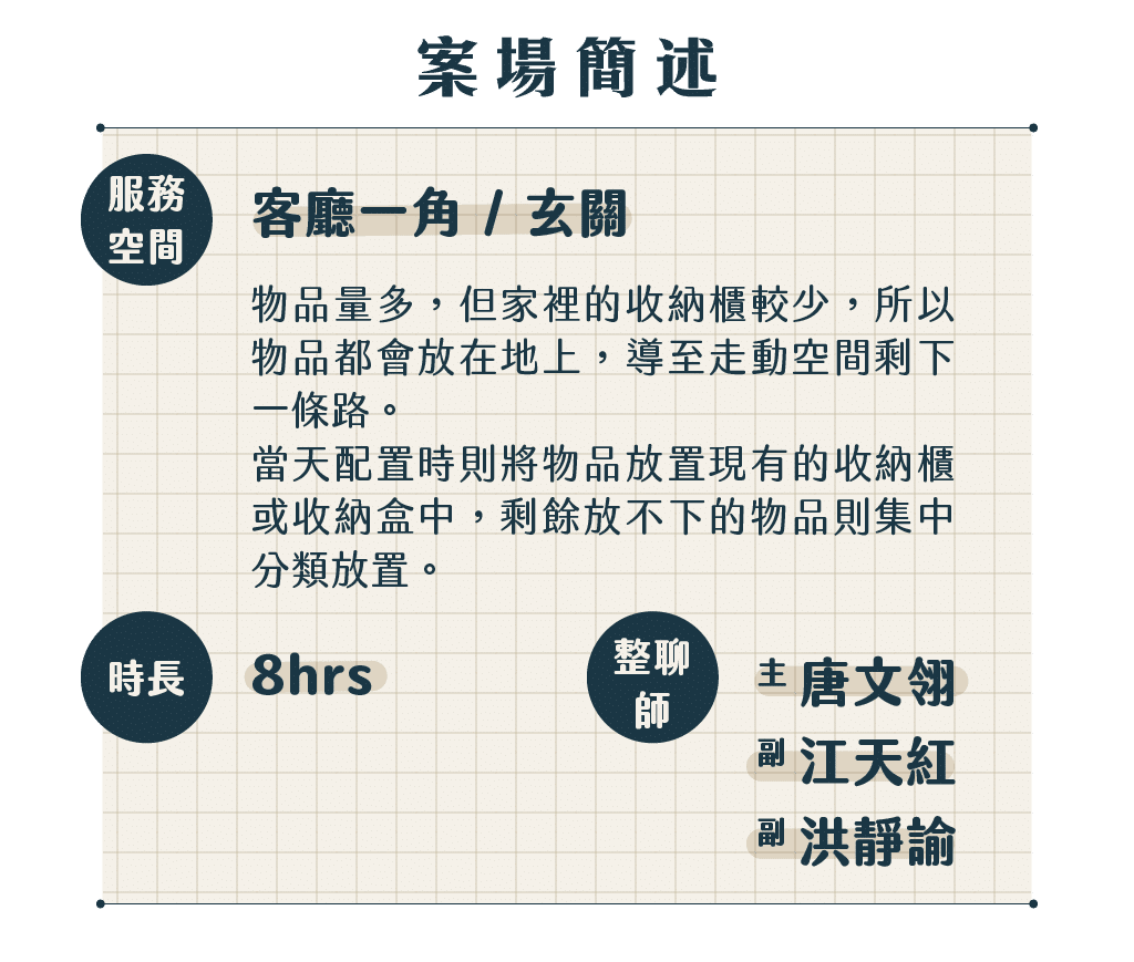 22坪大的房子住著3口人2隻貓,當整聊師進屋時,物品堆積在各個檯面上,僅留下一條走道還能行走,玄關處即堆滿紙箱、未拆封團購品,客戶喜歡參與團購,但房屋沒有足夠的收納櫃體,住了五年的房子越堆越多,已快要失去生活功能。