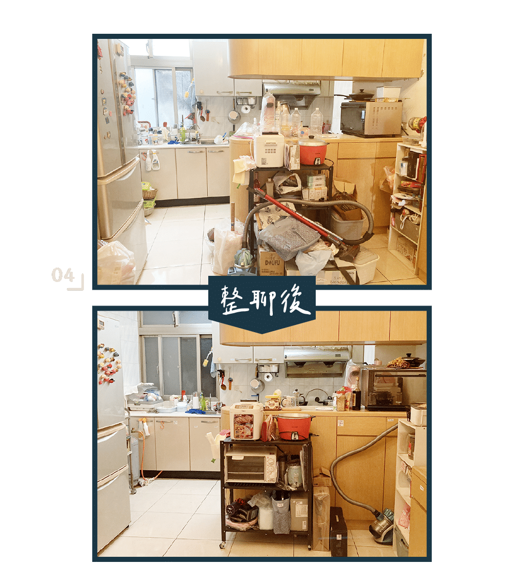 協助客戶對捨離後,把會造成健康疑慮的過期食品先淘汰,接下來再把不成對的鍋具、保鮮盒一一配對,最後給出收納品的建議、空間的配置與動線安排。